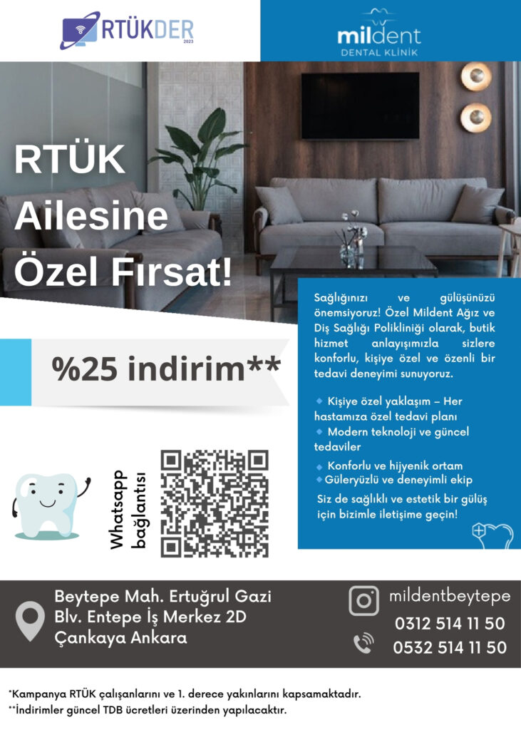 Kurumumuza yakın konumda bulunan Mildent Ağız ve Diş Sağlığı Polikliniği ile yapılan indirim protokolü kapsamında, 1 Temmuz 2025 – 1 Temmuz 2026 tarihleri arasında geçerli olmak üzere: